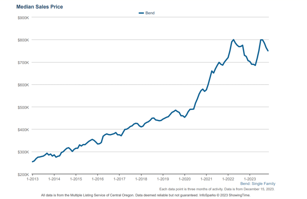 Let’s start with the biggest talking point in the market right now: mortgage rates. Without question, this has been the most important factor and the primary driver of the slowdown in sales over the past 18 months. However, after many months of speculation that mortgage rates would drop, we are finally seeing the signs of sustained relief. As of the beginning of November, rates were hovering just shy of 8%. Currently, at the time of this writing, rates are just shy of 7%. For perspective, consider a median-priced home in Bend with a 20% down payment. This change in rates would reduce the mortgage payment by about 10%, saving a buyer approximately $400 per month.
