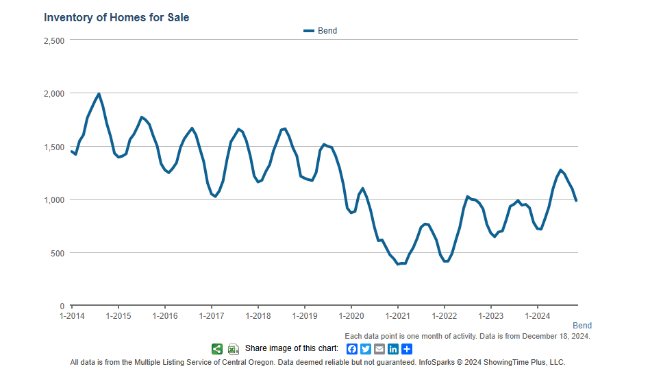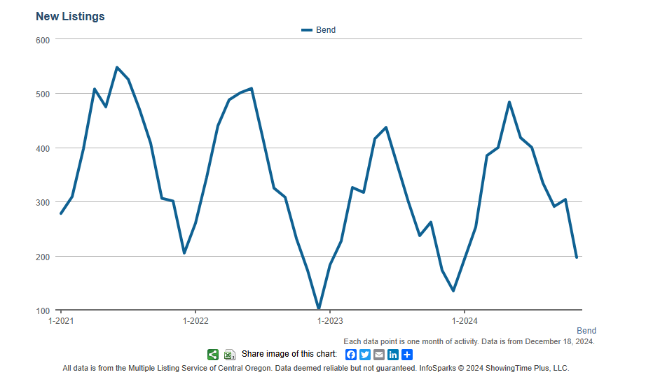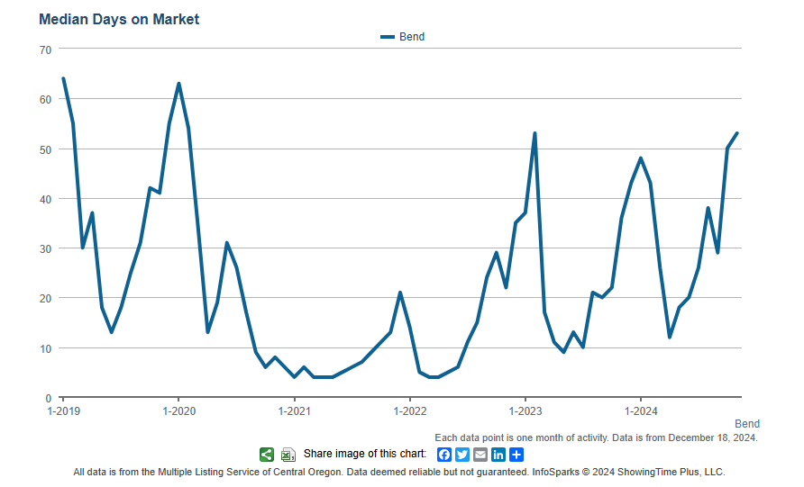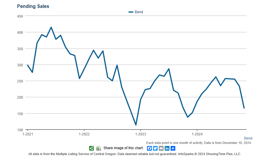 The average and median days on market ticked up again in November, and we are now very close to where we were to start the year. Overall, homes that have been sitting for a while are unusually the ones that sell in the winter as buyers try to do some bargain shopping. The median days on the market is now just shy of two months and if history is any indication, we would expect that it would peak in the next month or two and then continue to drop as spring buyers step back in the market. Please also keep in mind that we continue to track the number of homes that are selling quickly, and about 18% of the current Pending Sales in Bend, went Pending in a week. We would caution buyers from thinking that they always have time to sit back and wait, and if they see a home that is presented, priced, and marketed well, there is a good chance it will go pending in less than the median would indicate.