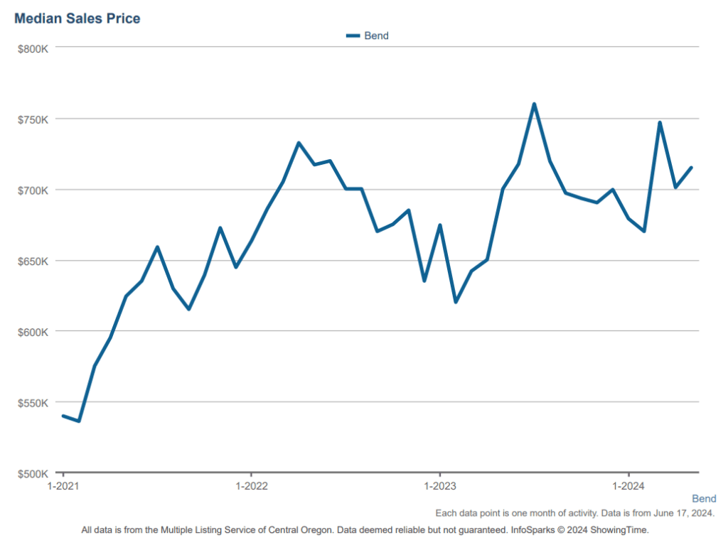 As we have discussed previously, there are cyclical patterns that we would expect to see. One of these is the expected rise in homes for sale. This past month, we saw an expected rise in the number of available homes for sale. Generally speaking, this normally ticks up during the first half of the year and then tapers off in the second half of the year. So far in 2024, we are continuing to follow this trend, but what is worth noting is the number itself. We are now higher than we have been since the start of the pandemic with an average of about 1000 homes for sale in Bend. For a little perspective, although this is the highest we have seen in 4 years, we are still roughly 33% lower than what we had in 2019. We would need to see 500 more homes come to market without selling to be back at the levels we were accustomed to just a few years ago.