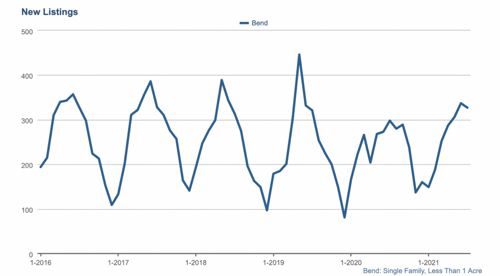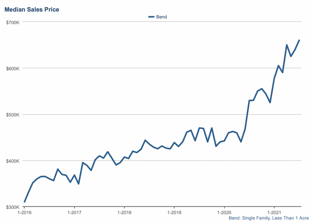 According to MLS data, the median home price in Bend reached $660,000 in July, which is slightly higher than the $640,000 result from June. For perspective, this median home price represents a high for the year and is about 22% higher than where it was in July 2020. Looking at year-to-date, we are at a 12% increase in the median home price since the start of 2021 and are a whopping 45% higher than January 2020.