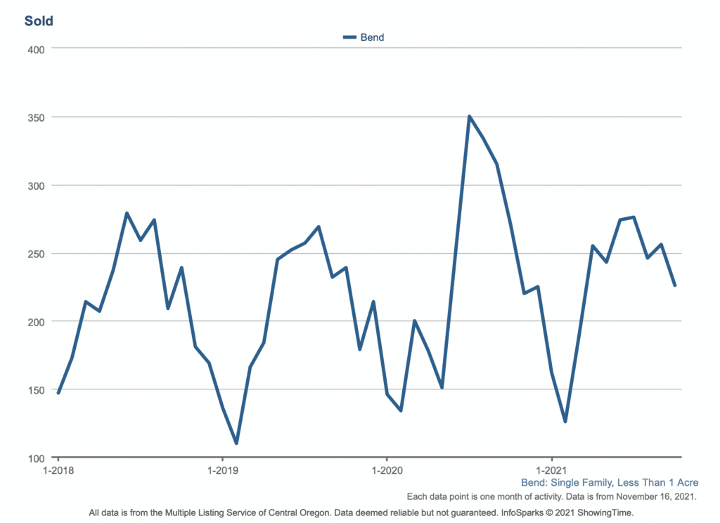 The number of homes sold in October also remained consistent with recent non-COVID years, showing 226 homes sold for the month. We have included a chart of the monthly trends for sold activity for the past few years. Visually, you can see that this year actually has a very similar shape and trend pattern to previous years, except 2020. However, what is not clear on this chart is that although the number of sales is consistent over this period, the number of homes available for sale is drastically lower than it was in years past. In 2018, when 239 homes sold, there were 869 houses available for sale (roughly four months of inventory). In October 2021, 226 homes were sold with 326 available for sale (a little over one month of inventory).