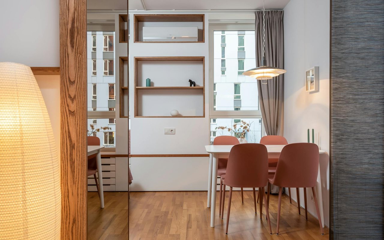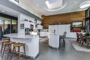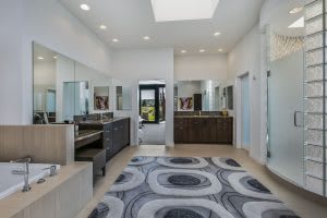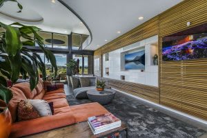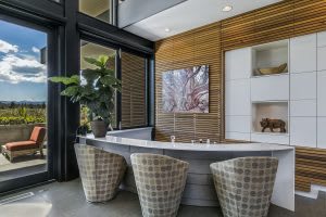 The great room features floor-to-ceiling windows that look out to panoramic mountain views, a sunken bar with a pass-through window to the exterior patio, a living area with custom gloss lacquer built-ins, two dining areas, and a Spark modern see-through indoor/ outdoor linear gas burner fireplace. It also offers a gourmet kitchen that boasts cabinets and fixtures by Pedini of Italy, quartz slab countertops, two breakfast bars , and top-of-the-line appliances.