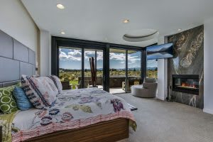 The spacious master suite features floor-to-ceiling windows that frame the mountain views, a recessed marble slab fireplace, a large his/hers walk-in closet, a double vanity and commodes, a double shower with skylight, and a large soaking tub. The interior of this estate is also home to 3 additional suites, a fitness room, an office, a utility room, a double attached garage, and plenty of storage space. The exterior is perfect for entertaining. Its 16’ deep covered patio offers dining areas, a large grill, a hot tub, an indoor/outdoor gas fireplace as well as a built-in gas fire pit and bar area with a pass-through window.
