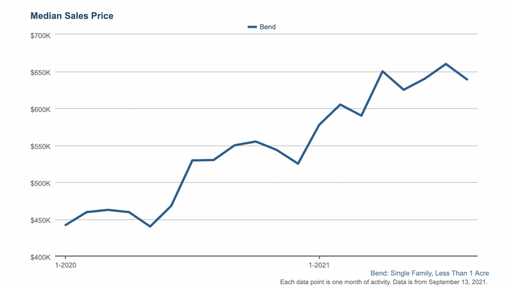 According to MLS data, the median home price in Bend retracted a bit to $639,000 in August and sits about 4% off the highs for the year which were set in April. This number stands almost 21% higher than where it was last August and is about 10.6% higher than where it was in January of this year.