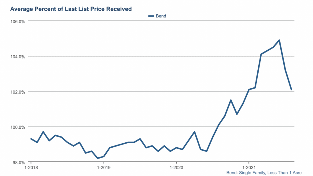 It is no surprise that with homes selling in days, the average sale to list price still remains high. What may surprise you is that they are still averaging 102% of asking price. Please keep in mind that like many of the numbers we track, the results are lagging and tracking sales that went Pending 30-60 days ago. With price changes on the rise over the last 2 months, we fully expect to see this number continue to decrease and get closer to what has historically been the norm in Bend (98-99% of asking price). The question is, how long will that take? Although we can’t predict this with any certainty, if the pace from recent months continues, we could see an average sale to list price of under 100% in the next two months.