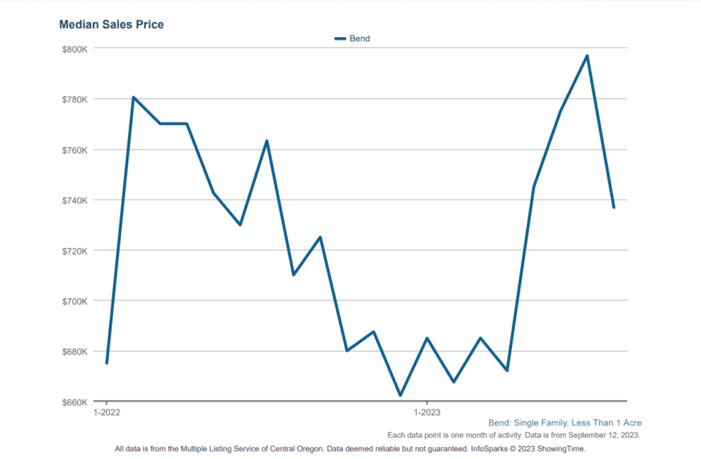 In August, single-family homes in Bend sold at an average of 96.9% of the original list price. This is right in line with what we would normally expect in Bend and in the range of 96-98% which was the standard in the years leading up to the pandemic. We should note that this percentage is the percent of the original list price and that if you look at the percentage of the last list price, the percentage is closer to 99%. Last month there were 237 price changes in Bend which was down 28% year over year. This means that sellers are becoming increasingly more realistic with their pricing and not requiring as many price reductions or rounds of negotiations to get their homes sold.