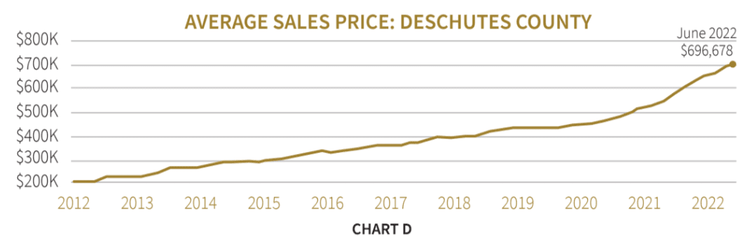 In our last installment of the State of the Market in the first quarter of 2022, we indicated to sellers to expect a shift. At the time, the metrics had not yet caught up with our “feet on the street” experience in the Central Oregon market, and headlines were still implying the market remained “red hot.” The truth of the matter is an age-old tale: lagging data delivers headlines, but leading indicators are hard to quantify. All this said, the ensuing shift has not upended things quite as acutely as some had feared. Median sale price, though leveling off, has reached a $700,000 zenith. A seller anywhere in Deschutes County can expect an average of 29 days on market – though understandably longer for luxury homes (84 days average), acreage property (86 days average), or bare land(74 days average)(Chart D). As well, the current inventory during the tail end of this peak summer selling season in Deschutes County has increased from one month of inventory to three months of inventory – but remains firmly a sellers’ market. Six months (or more) is typically the threshold of transition to a “buyers market” as we understand it.