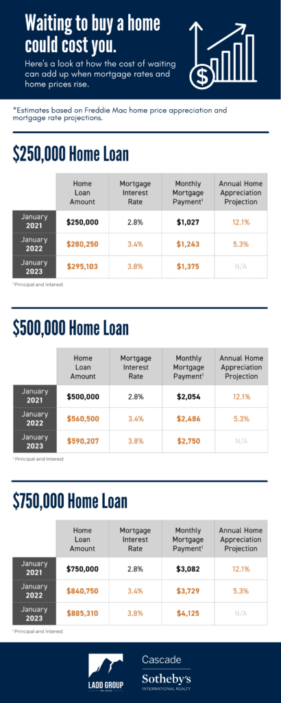If for instance you take out a $500,000 home loan in 2021 with an interest rate of 2.8%, your monthly mortgage payment will be $2,054, and your home could potentially appreciate 12.1%. Compare this to waiting to purchase the same home in two years. Taking appreciation into account, the same home in 2023 would now cost $590,000. If interest rates rise even just one percent, this would increase your monthly mortgage payment from $2,054 to $2,750, and you’d be paying $696 more per month.If purchasing a home makes sense for you right now, we’d love to speak to you about your options.