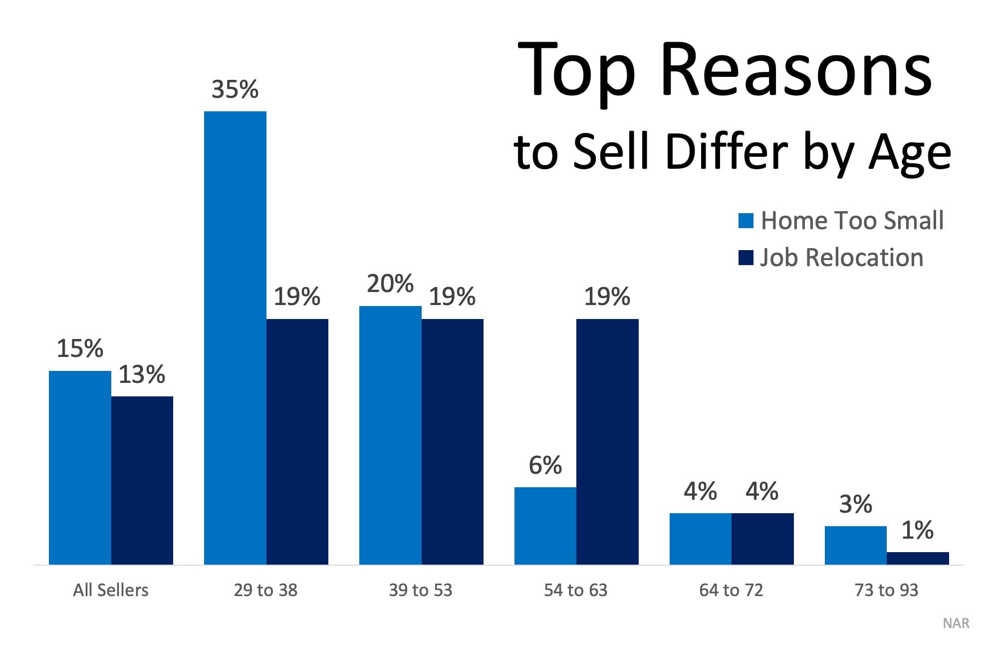 The younger the respondents, the more likely their top response centered around needing a larger home (ages 29 to 53). Relocating for a job was the top reason for those ages 54 to 63 and the second most popular response for those under 53. The chart below shows the breakdown for these two reasons.