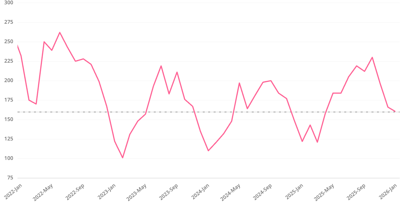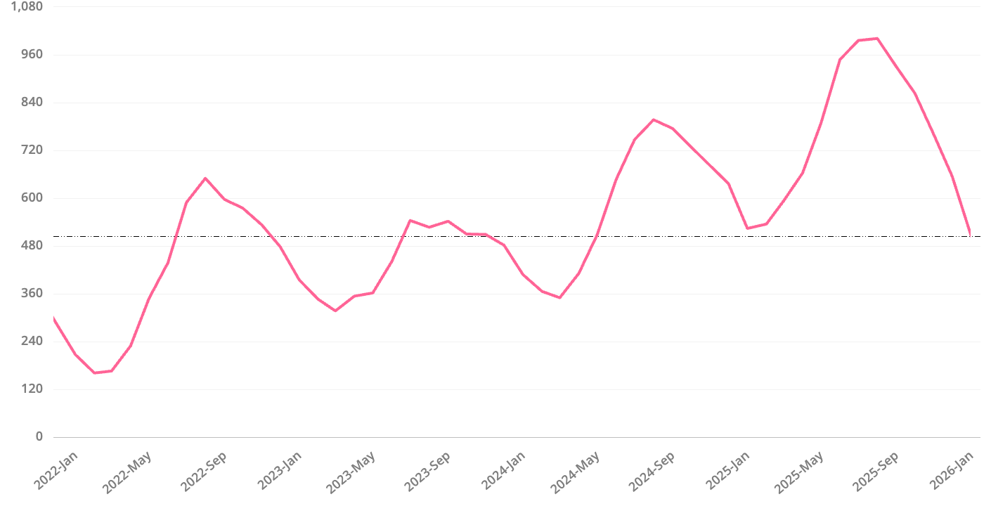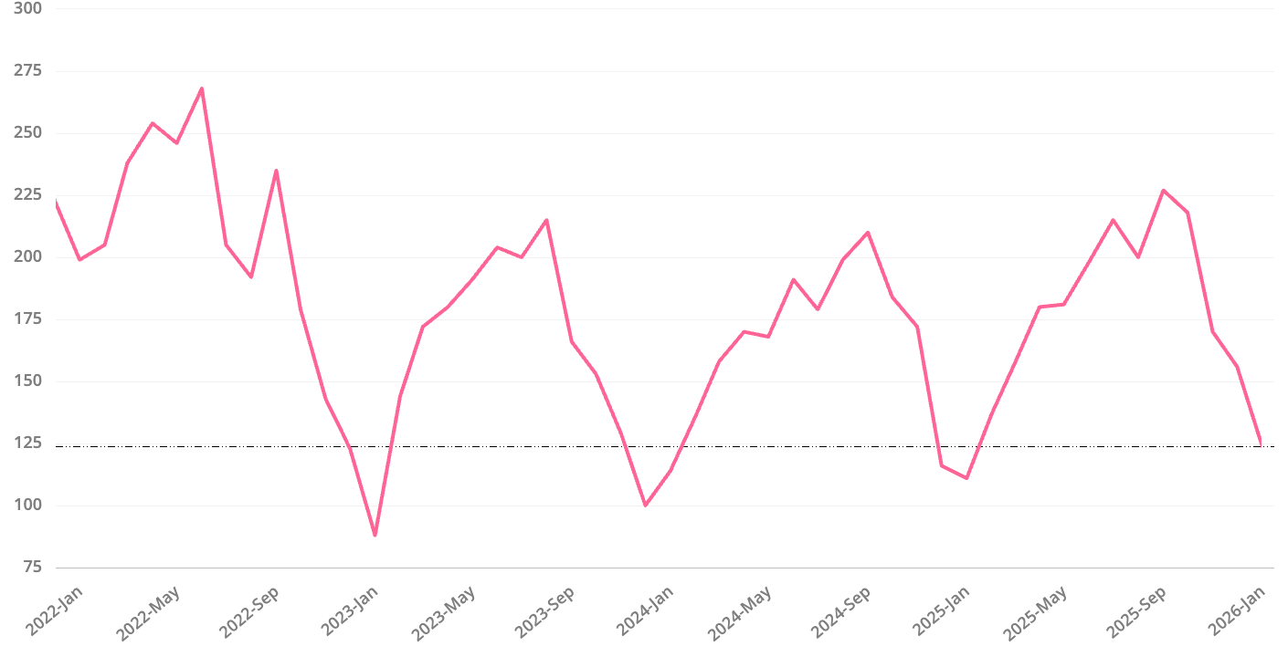 Days on Market for pending homes is at 66 Days. This means that the homes that went Pending in December received their accepted offer in just over 2 months. This is identical to December 2024 and just slightly lower than in November. As you can see in the chart below, Days on Market usually peaks in December and then proceeds to decline for about 6 months before beginning to tick up again. For reference, in 2025, the low point was 80% off the peak. This means buyers should be mindful that it is likely to get more competitive in the coming months.